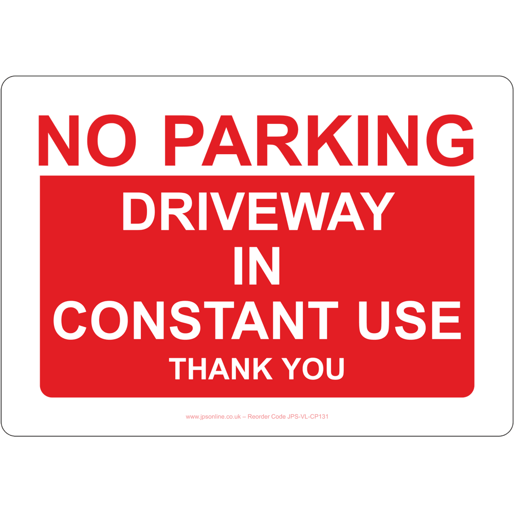 No Parking Driveway In Constant Use Sign - A5 148mm x 210mm / 1mm Rigid Plastic / 1 is backordered and will ship as soon as it is back in stock.
